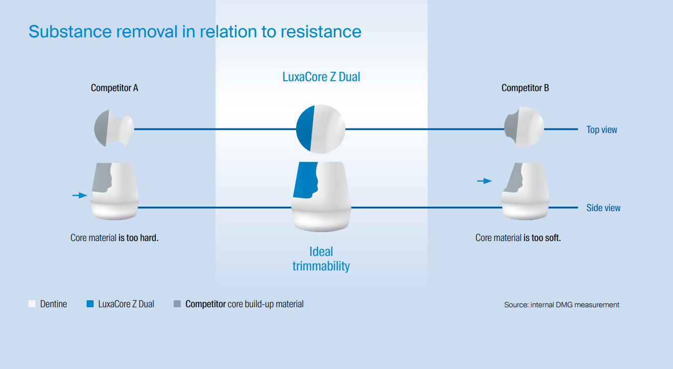 Além de sua excelente estabilidade e fluidez, bem como sua alta resistência à compressão e flexão, o LuxaCore Z Dual realmente impressiona com sua capacidade de corte quase natural, semelhante à da dentina. O LuxaCore Z Dual supera significativamente seus produtos concorrentes em estudos e testes práticos. Isso se deve à textura do LuxaCore Z Dual que difere apenas marginalmente daquela da dentina natural, garantindo uma remoção controlada da substância sem sulcos ou degraus nos núcleos de preenchimento. Essa capacidade de corte ideal garante preparações sem sulcos, sem qualquer transição perceptível e, consequentemente, restaurações robustas.